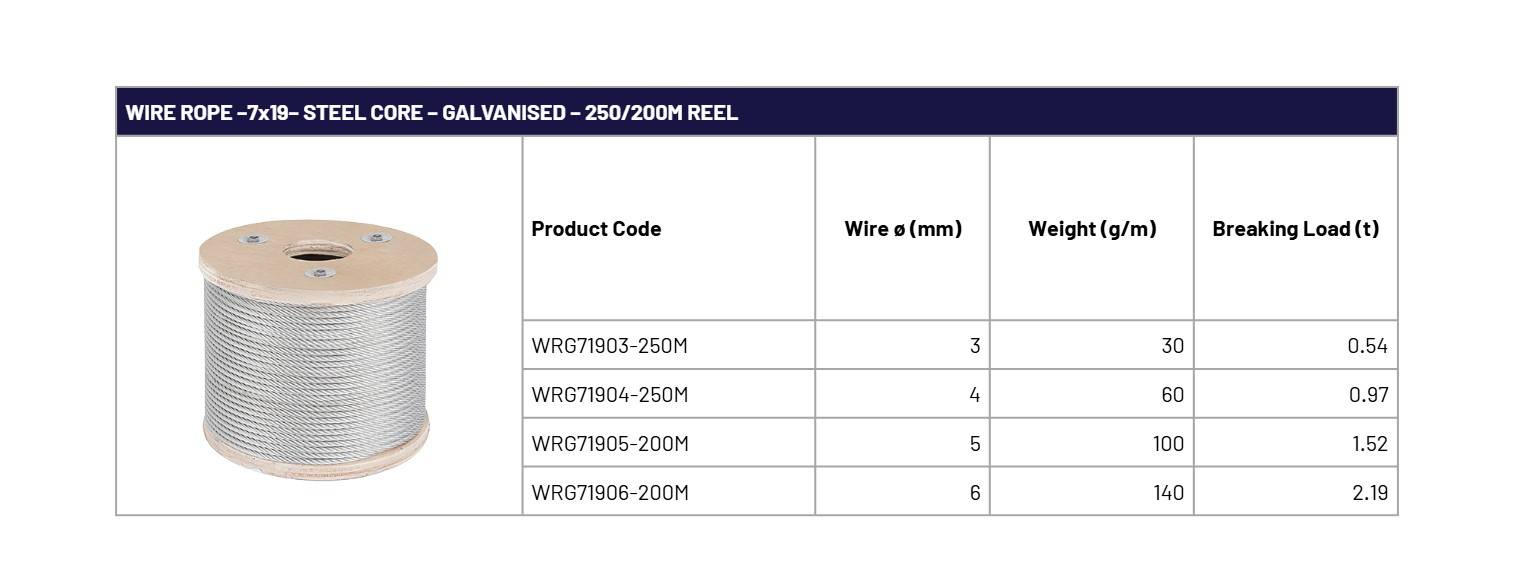 7×19 Galvanised Steel Wire Rope. Extra flexible galvanised steel wire rope with a 7×19 construction is suitable where high flexibility & fatigue performance are important, 3mm – 6mm diameter available from stock Typical applications are load running applications such as winches, hoists, security cables and general use.